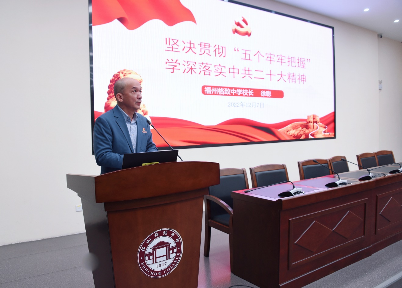 发表时间:2022-12-08 17:00 为深入学习宣传贯彻落实党的二十大精神,进一步兴起学习热潮,12月7日,福州格致中学二十大精神宣讲报告会在学术报告厅举行。福州格致中学校长徐聪以《坚决贯彻“五个牢牢把握” 学深落实中共二十大精神》为题,为全体党员干部职工作专题宣讲。
