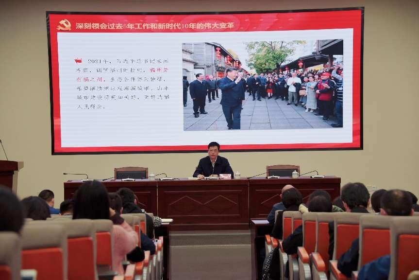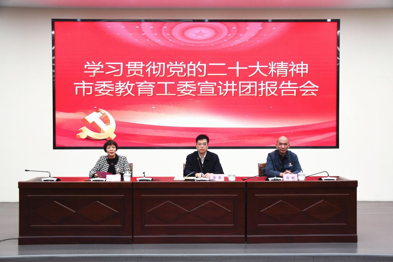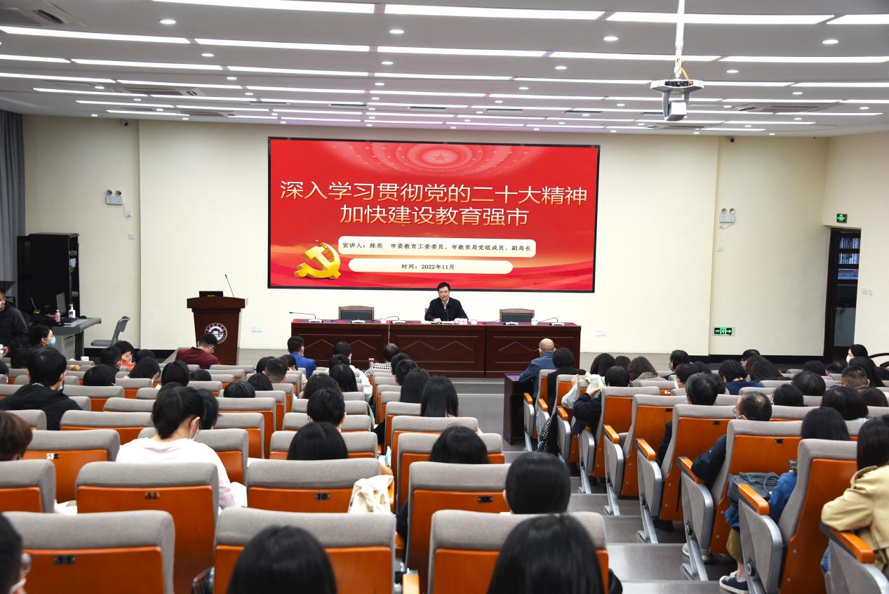 报告会上, 陈亮副局长以“深入学习贯彻党的二十大精神,加快建设教育强市”为主题,从深刻领会党的二十大主题、深刻领会过去五年工作和新时代十年的伟大变革、深刻领会习近平新时代中国特色社会主义思想的世界观和方法论、深刻领会以中国式现代化推进中华民族伟大复兴的使命任务、深刻领会未来一个时期党和国家事业发展的重大部署、深刻领会以伟大自我革命引领伟大社会革命的重要要求、深刻领会党的二十大关于教育的重要论述、推动党的二十大精神在全市教育系统落实落地等八个方面,对党的二十大精神作了全面系统的宣讲报告。