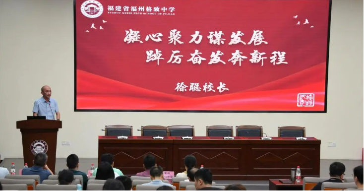 徐聪校长首先总结了格致教育集团成立2年来在党建、教育教学等各方面工作取得一系列成绩。肯定集团成立以来三个突出特点:一是创机制,融聚集团力量;二是显特色,融汇优质资源;三是亮品牌,融合赋能发展。今后格致教育集团将继续以“办好人民满意的教育”为宗旨,以促进教育均衡发展为目标,着力打造互助共赢的发展共同体,从完善长效机制、共享优质资源、加强队伍建设、提升办学效益等方面促进集团校高质量、内涵式发展,打造“大格致”品牌,继续扩大福州格致中学教育集团办学品牌的示范辐射面。接着,徐校长强调2023-2024学年要以高质量发展为重点,进一步优化现代学校治理:要深化改革,创新机制,增强动能;要优化管理,强化责任,增强效率。学校工作要做到“三个坚持”:首先,坚持以高质量党建融合为引擎,汇聚高质量发展的动力,推动高质量发展;第二,坚持以立德树人为根本任务,以课程思政为抓手,创新育人模式;第三,坚持以提高质量为核心,强化内涵建设,提高核心竞争力。最后,徐校长希望大家充分把握机遇,勇挑重担,辛勤耕耘,扎实工作,敢于探索,久久为功,为格致的教育事业发展做出更大的贡献。