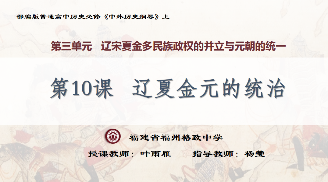 莆田四中韩如云老师以《契丹人引马图》为导入,带领学生解读历史壁画,了解北方少数民族的特征,培养学生史料解读的能力同时创设情景进入新课学习。接着,课程围绕“塞外雄风”“大哉乾元”“天下一家”有序展开,通过学生担任“历史播报员”介绍辽夏金元的统治概况,在师生互动中体现中国历史从“小中国”到“大中国”的转变,以小见大,逻辑严密,思路清晰。课堂上学生积极思考,课堂气氛活跃。