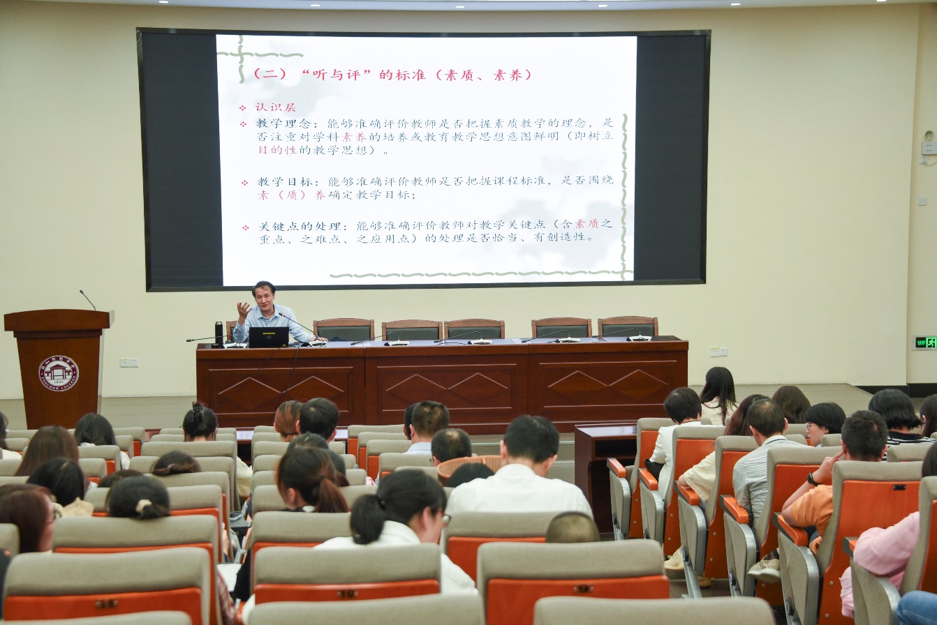 发表时间:2023-11-02 10:23 今天的学生就是未来实现中华民族伟大复兴中国梦的主力军,广大教师就是打造这支中华民族“梦之队”的筑梦人。 ——习近平 2023年11月1日下午,福州格致中学开展教师校本研训,举办青年教师筑梦计划第九次教研活动。本次活动邀请到福建教育学院林藩教授为与会教师带来“走向专业的听评课”主题讲座。教务处林沁副主任主持本场讲座。