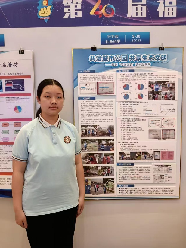 青少年科技创新项目作品名称: 共治城市公园 共享生态文明——福州“市民园长”调研与实践学科: 行为和社会科学获奖选手:邱嘉琳指导老师:徐敏、杨圣炜、林鹏此外,我校在第40届福建省青少年科技创新大赛有3个项目荣获得省三等奖,特此祝贺!