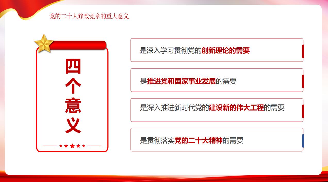 党课重点围绕中国共产党章程基本概述、党的二十大修改党章的重大意义、全面把握党章修改的重要内容三个方面进行了详细解读。针对新党章的50处修改内容,包括总纲部分的37处修改,条文部分的13处修改,党章的新观点、新论断以及对当前党的基层组织和党员提出的新要求、新任务进行了重点学习。内容生动详实,既有政治高度,又有理论深度,使广大党员对《中国共产党章程》的发展历程有了进一步的了解和认识,为进一步学好党章、遵守党章、坚决维护党章指明了方向。