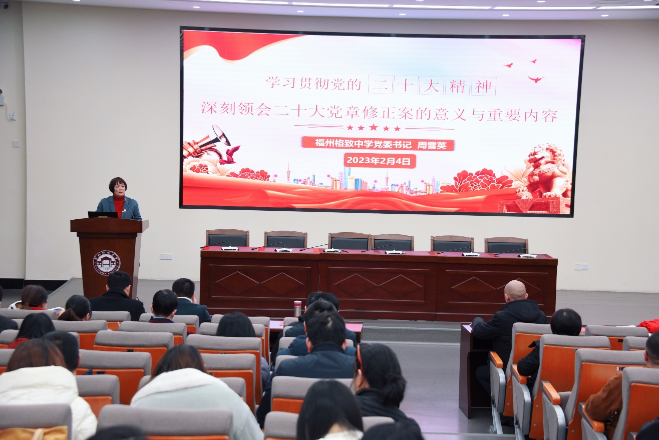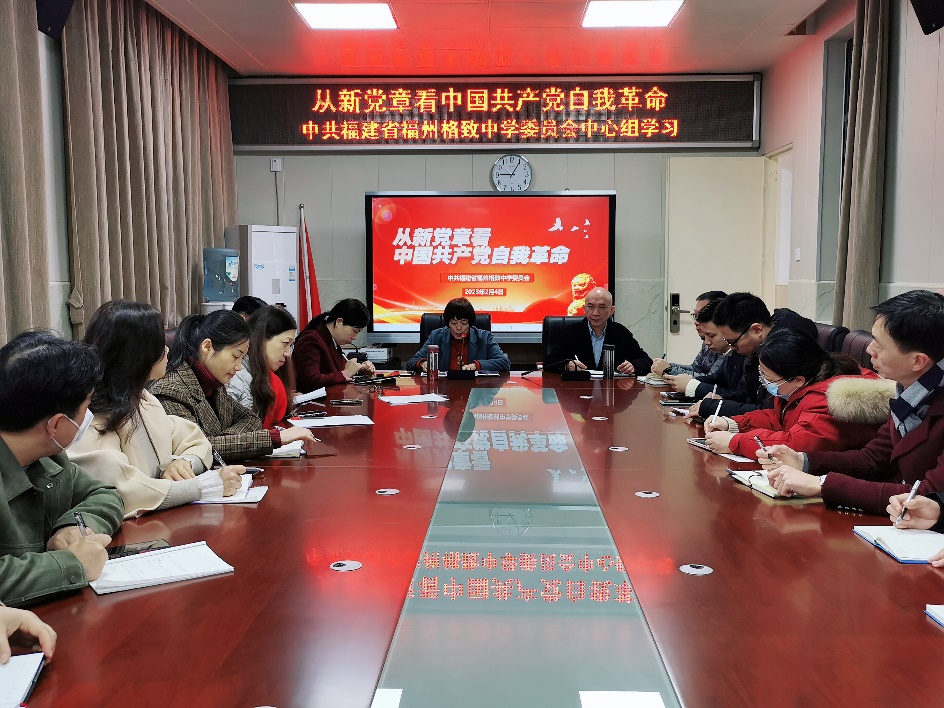 发表时间:2023-02-06 15:41 为深入学习宣传贯彻党的二十大精神,进一步学深悟透新党章的内涵,引导全体党员教师尊崇党章、严守党规、遵守党纪的自觉意识,2月4日,福州格致中学开展党章学习专题活动。头雁示范,中心组学习共研讨 4日上午,新党章中心组学习(扩大)会在行政楼六楼会议室召开。会前,中心组成员自行学习新党章及相关资料,领会党章修正案的重大背景、重要内容和深刻影响。党委书记周雪英以“从新党章看中国共产党自我革命”为题,从“彰显清醒的历史自觉——自我革命永远在路上;提供有力的制度保障——推动和完善党和国家监督体系;明晰科学的路径方法——一体推进不敢腐、不能腐、不想腐” 三个维度带头作了学习分享。中心组成员们结合党章和具体工作,谈认识、谈体会、谈感想,进行深入的研讨和交流。