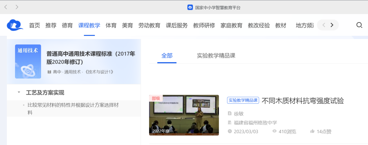 发表时间:2023-08-21 19:40 教务部教育技术与资源发展中心组织的中小学实验教学精品课遴选活动中,我校徐敏老师的课例《不同木质材料抗弯强度试验》入选全国中小学实验教学精品课。