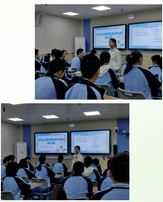上午第二节,我校高二组的陈丽娜老师以科学·技术·社会为主线开展《评价应用激素类药物的利与弊》一课,通过创设真实生活情境,引导学生分析三类激素的综合应用,渗透生命教育,使学生加深对人体生命特征的了解,明确生态环境变化对人类发展的影响,自觉养成健康的生活方式。 在学习体液调节的基础上,陈丽娜老师用生动形象的教学情境导入,用糖皮质激素等激素为例带领学生探究其作用机理,教学内容层层递进,步步深入,从药用激素到环境激素,从现象到本质,在效果、技术操作等多角度评价激素应用,宣传健康理念,学生在迁移应用、合作交流能力等方面获得提升,紧扣生物学学科教学目标,提高学生核心素养。