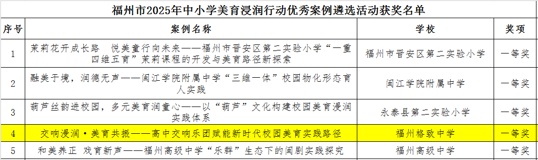 发表时间:2025-07-04 10:45 近日,由福州市教育局主办的2025年中小学美育浸润行动优秀案例遴选活动评审结果公布,我校音乐教师刘昕撰写的美育案例《交响浸润·美育共振——高中交响乐团赋能新时代校园美育实践路径》,荣获一等奖!